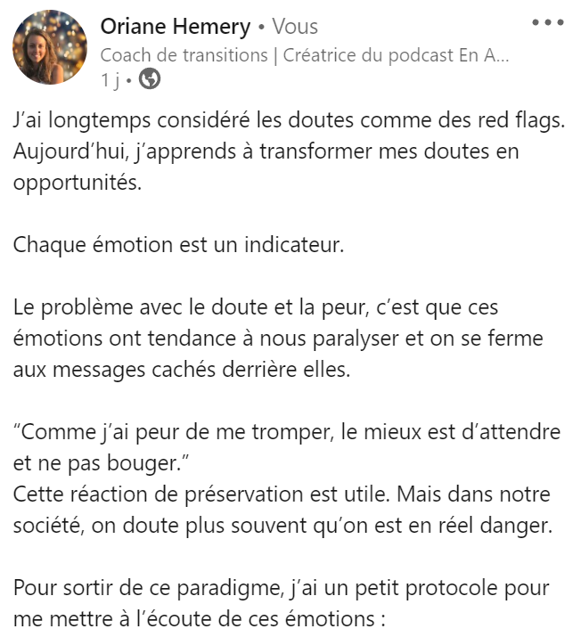 J'ai pu mettre la main sur des points qui m'ont toujours bloquée. Un programme avec beaucoup beaucoup de bienveillance, pas de jugement, de l'entraide même. Oriane, tu sais comment motiver les troupes, tu es juste et tes conseils sont vraiment bons ! MERCI.